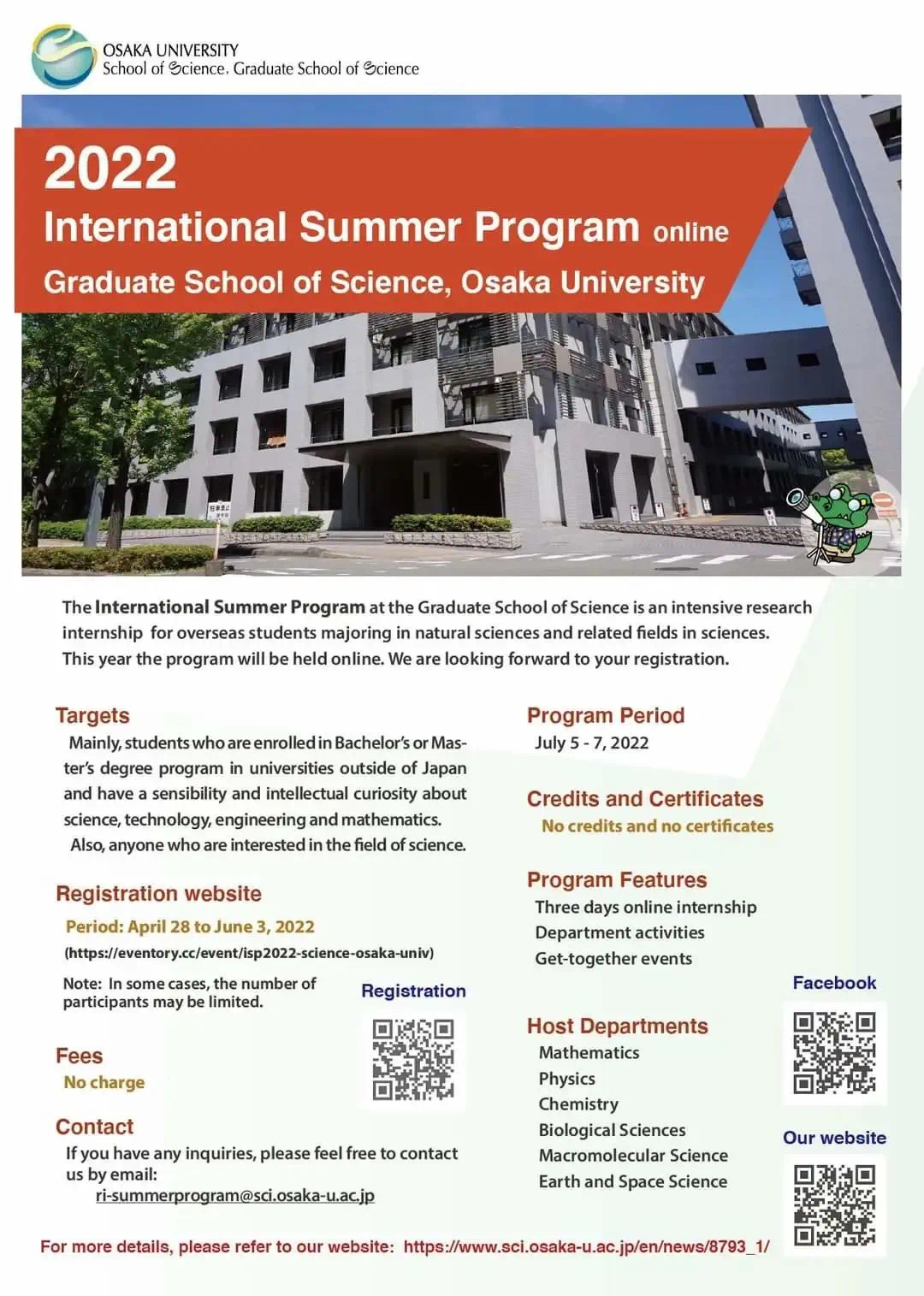 大阪大学科学研究院(GSS)的国际暑期项目是为主修自然科学和相关科学领域的海外学生提供的密集研究实习。今年,该项目将在网上举行。今年的项目将使你有机会了解大阪大学理科研究生院的六个系正在进行的研究活动。此外,该项目还包括社交活动,以便与大阪大学的其他学生建立良好的关系。