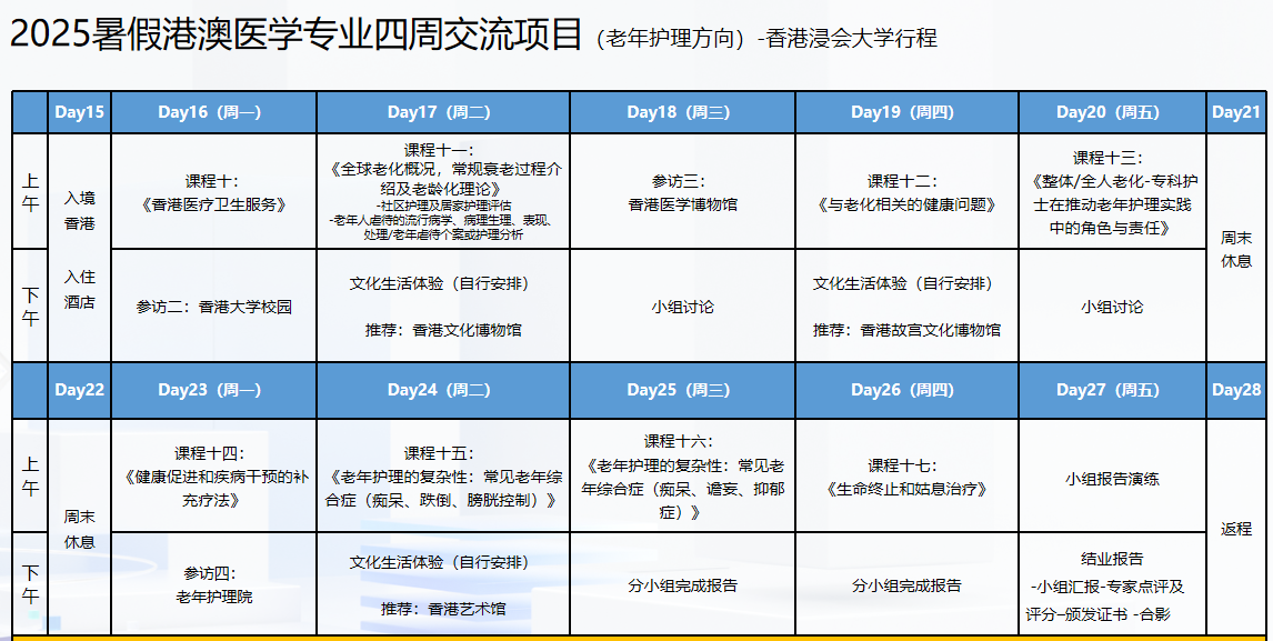 该项目联合香港浸会大学、澳门科技大学,主旨让学员了解港澳的医疗服务特点, 澳科大的学习主要围绕当今医学最新前沿话题进行交流学习 ,了解更多交叉学科知识;港浸大的学习主要探讨国际与香港社区医疗及最新开展的相关医疗服务。希望通过四周的交流学习可以帮助到同学们在未来职业发展道路上提供更多可能性,与此同时可以结识来自不同地区不同文化背景的同伴, 建立人脉网络。
